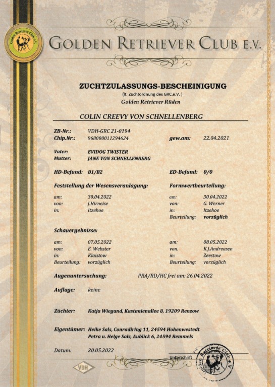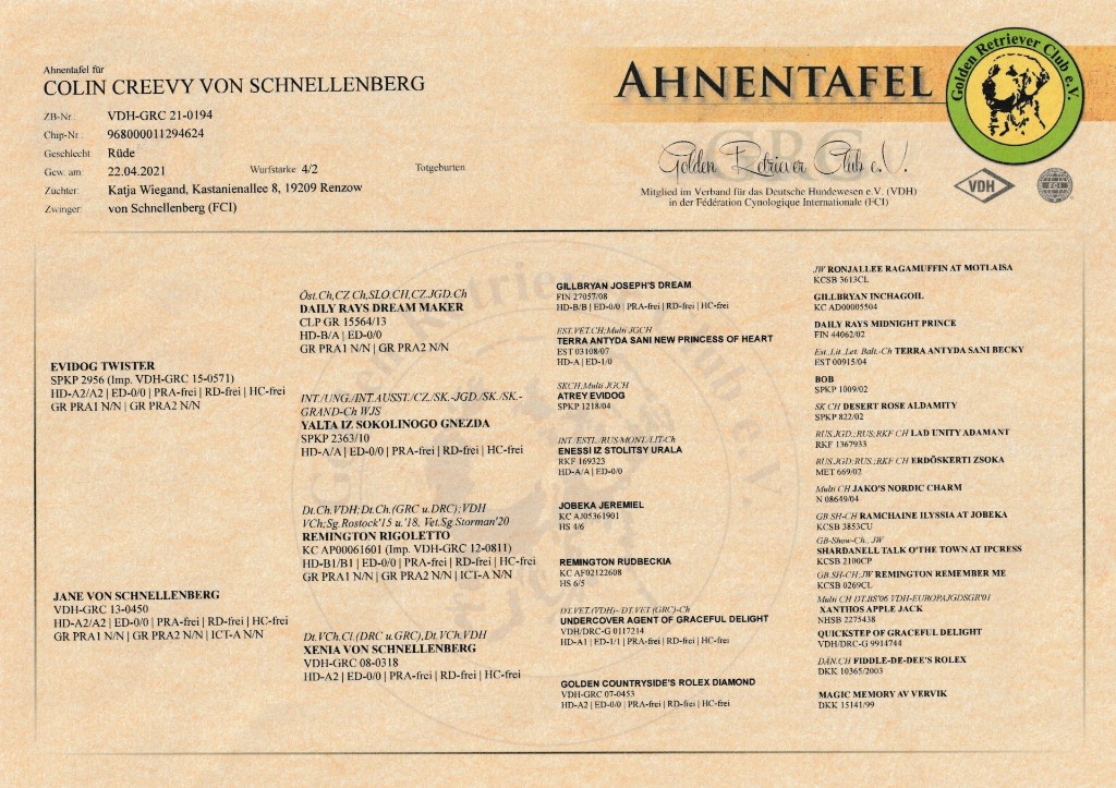 HD: B1/B2 ED: 0/0 DNA PRA/RD/HC frei am 26.04.22 GR-PRA1: Frei nach Erbgang GR-PRA2: Frei nach Erbgang Ichthyose: Clear