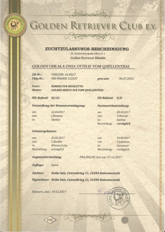GRC-Schau Itzehoe am 14.05.17 Richterin: Kathy Braekman, B Vorzüglich DRC-Schau Winsen/Luhe am 25.06.17 Richterin: Mr. Colm Beattie, IRL Vorzüglich 4.Platz GRC-Schau Hammoor am 19.08.17 Richter: Filip Johnsson ,S Vorzüglich SRA Hoisdorf am 22.07.2018 Richterin: S. Scarpellini, I, Vorzüglich Würfe P-Wurf 30.03.19 8 Welpen Q-Wurf 22.08.20 7 Welpen R-Wurf 18.01.22 5 Welpen Prüfungen: